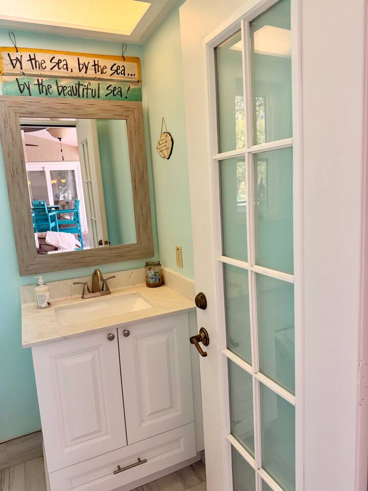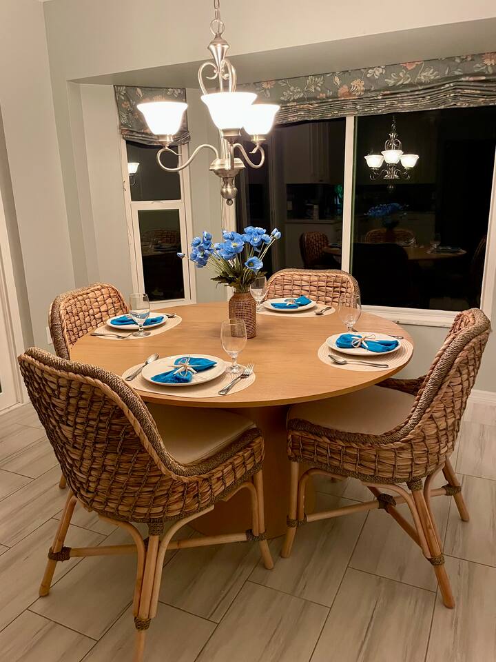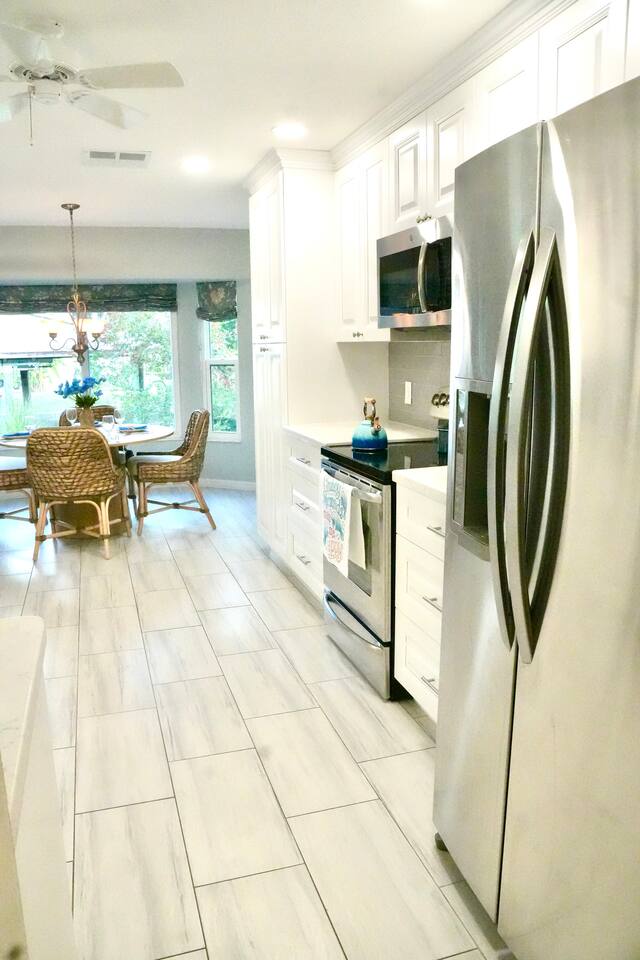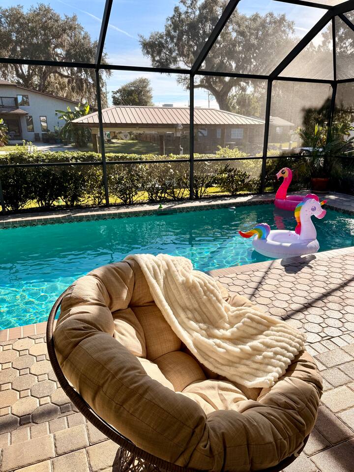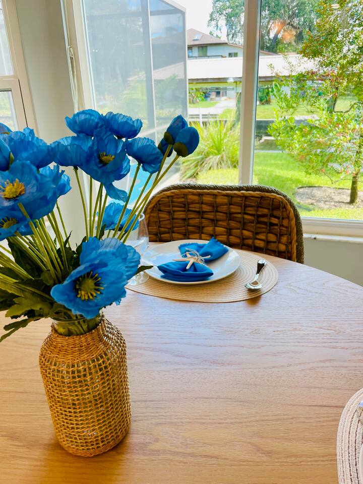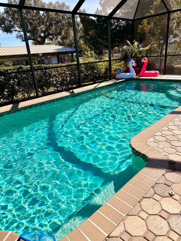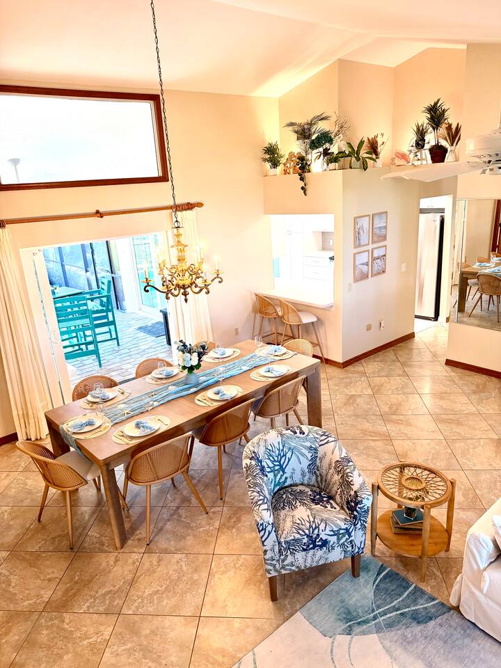 Property Details – The Floaty Potato Bedrooms & Bathrooms - 3 Bedrooms · 2.5 Bathrooms · Sleeps 8-9 - Primary Suite: King bed, ensuite with jetted tub, direct pool access, Smart TV - Bedroom 2: King bed, Smart TV - Bedroom 3: Two twin beds with twin trundles and a child-size fold-out chair (sleeps up to 5 children or 2 adults), Smart TV Autism-friendly items available upon request: body sock, weighted blanket, sensory fidgets, peanut ball, and silencing headphones Kitchen & Dining - Fully equipped kitchen with stainless steel appliances, crockpot, griddle, toaster, blender and tea kettle (bring your own food and drinks). - Coffee station with large starter supply of K-cups, grounds, tea, cocoa, creamer, and honey. - Four dining areas: solid oak kitchen nook (4), bar (2), solid wood dining table (8), and patio table (4) - Baby and child items: highchair, baby monitor, unbreakable BPA-free dishes, sippy cup, bib, and kids’ books Living & Entertainment - Open-concept living area with Smart TV, solid oak entertainment center with furniture covers and elegant coastal décor - Garage games: ping-pong table and basketball arcade -Indoor games: family board games - Couch covers for furry friends or those with sticky fingers (located in entertainment center) - Desk and computer chair with high-speed WiFi Outdoor Living - Screened-in SOLAR-HEATED pool included year-round. For an extra boost of warmth... OPTIONAL electric pool heat available November–March for $40/night (Added upon request. Must be paid in advance). - Outdoor kitchen with grill, sink, and mini-refrigerator - Floating and stationary docks with a fish-cleaning station - Garage Fridge to store your catch or extra groceries - Boat lift (bring or rent your own boat). Must sign additional user agreement before use. No extra cost. - Fenced yard for privacy and safety - Outdoor games: cornhole, chalk, and sports balls Adventure Gear - 3 fishing kayaks, 1 youth kayak, 1 paddleboard, life jackets for all sizes - 3 adult fishing rods, 1 youth fishing rod, small assortment of tackle. - 2 adult bikes, 1 tandem bike, and 1 youth bike - Pool toys included - Beach bag pre-packed with sand toys and beach blanket. We have two beach chairs and a large empty cooler in the garage ready for your own snacks for a day at the beach! Extra Amenities - Professionally serviced for pests (That said, it is Florida and on the canal. Bugs happen.) - Pool professionally serviced with both solar-heat (year round) and electric (optional for an additional fee). - 90% all-natural cleaning and bath products - Smart thermostat and Wi-Fi - Outdoor security cameras (front and canal areas only) - Extra fridge in garage for fresh fish, scallops, or extra groceries - All guests must sign rental agreement.
