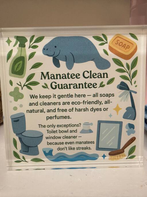 🚫 ABSOLUTE NO-NOs (Even for Sea Cows) 🚭 No smoking or vaping indoors. THAT INCLUDES IN THE POOL AREA. Float your smoke outside, please. 🎉 No parties, ragers, or “manatees gone wild” gatherings. 🚫 No illegal substances. The only thing we’re high on here is sea level. 👥 No surprise guests. If they weren’t part of the original pod, they don’t belong. 🐶 No pets unless approved in advance. Sneaky pups = dollar drama. PRE-APPROVAL REQUIRED. MESSAGE HOST BEFORE BOOKING 🍕 No food or beverages on the white couches. Keep them as bright as a manatee’s belly ✨ Enjoy your meals and beverages at one of the three dining spots instead. 🛋️ Use couch covers with pets or small children. 👶 Watch your small humans near the pool and dock. 🦈 If it looks dangerous, it probably is. 🛟 Wear your life jacket so you too can float like a manatee 😎 Keep it chill, clean the grill. 🫗If you make a spill, don’t let it float away — clean it up right away, the manatee way! 🤕 Manatees don’t drag or bang; please lift the kayaks gently. 💔If something gets bumped, bruised, or broken — don’t stay quiet like a shy sea cow. Tell your host right away, and we’ll keep the waters calm! 🚲Tandem bike is for skilled cyclists only. 🛶If gear swims away while you’re out to play (like bikes or toys), it’s your responsibility to replace — even manatees keep track of their floaties! 🎣 Manatees like tidy tackle. Untangled and Gut Free. Leave it like you found it. 🏠Cancellation Policy = Iron-Clad. Bring Your Own Insurance Floaties